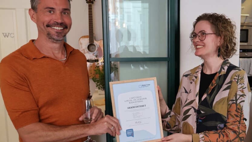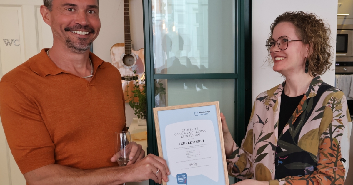 Der var en festlig stemning og smil på læberne, da frivillige, samarbejdspartnere og ansatte ved en reception fejrede, at Café Exits gælds- og juridiske rådgivning er blevet akkrediteret – og dermed har fået branchens kvalitetsstempel og en anerkendelse. Det fysiske bevis på anerkendelsen – et indrammet certifikat – overrakte Sabine Elm Klinker, der er direktør i RådgivningsDanmark, til organisationschef Peter Dexters, RådgivningsDanmark, der er en brancheforening for civilsamfundsorganisationer, som har rådgivningstilbud for mennesker i udsatte positioner, har stået for akkrediteringen.